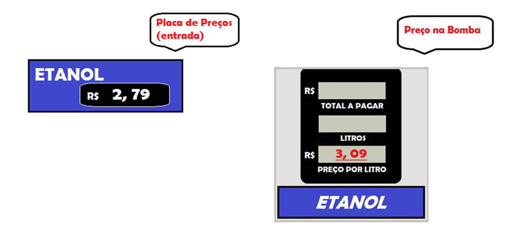 As reclamações abordam a diferença dos preços expostos nas entradas dos estabelecimentos (à vista) daqueles exibidos nas bombas de abastecimento (crédito), em razão de não constar ressalva sobre a alteração a depender da forma de pagamento escolhida, como demonstrado no exemplo abaixo: